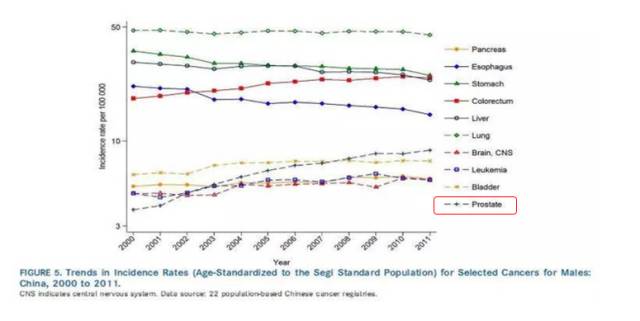 在世界范圍內,前列腺癌發(fā)病率位居男性惡性腫瘤第2位。我國前列腺癌發(fā)病率近年來(lái)呈顯著(zhù)上升趨勢(下圖上升幅度最大的線(xiàn)條),可能與社會(huì )老齡化、人口城市化、膳食結構西方化、檢測技術(shù)進(jìn)步相關(guān)。難言之隱,威脅男性健康,應引起足夠重視。 m.i7jk.cn