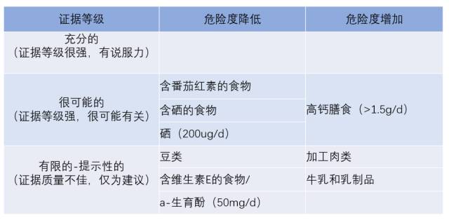 由上表可見(jiàn),飲食、營(yíng)養與前列腺癌發(fā)生的因果聯(lián)系并沒(méi)有強有力的證據,只是很可能有因果聯(lián)系或發(fā)生因果聯(lián)系的結論為建議性質(zhì)。