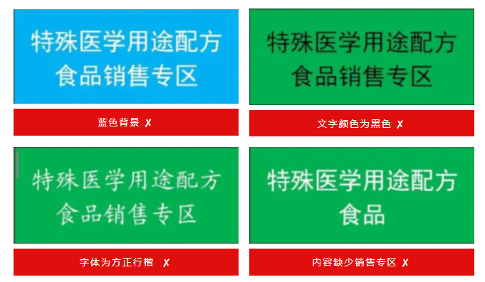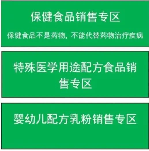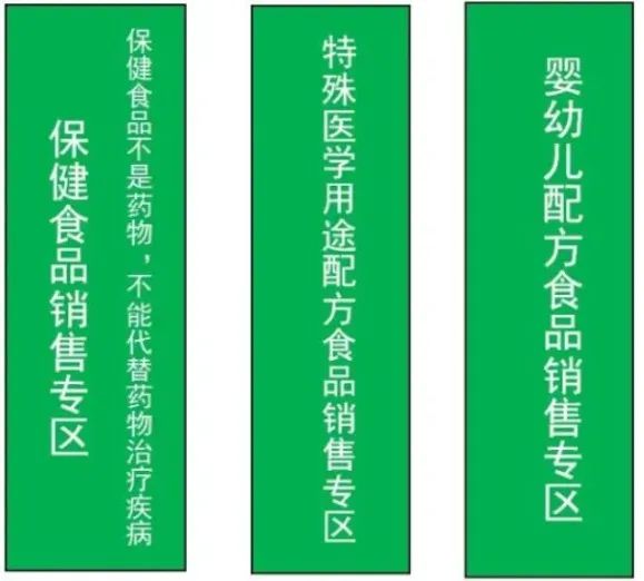 規范設立提示牌,醒目注明“保健食品銷(xiāo)售專(zhuān)區(專(zhuān)柜)”“嬰幼兒配方食品銷(xiāo)售專(zhuān)區(專(zhuān)柜)”“特殊醫學(xué)用途配方食品銷(xiāo)售專(zhuān)區(專(zhuān)柜)”字樣,提示牌為綠底白字,字體為黑體。