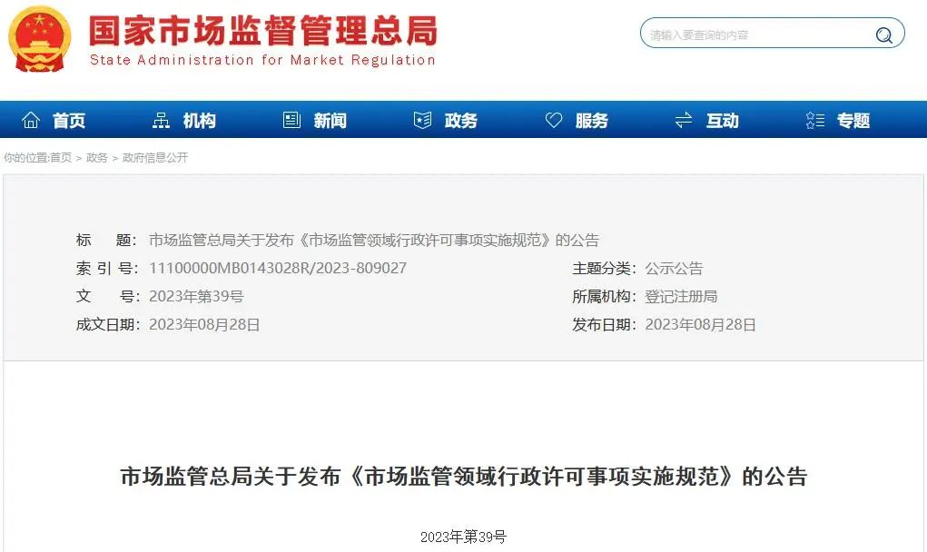 為貫徹落實(shí)《國務(wù)院辦公廳關(guān)于全面實(shí)行行政許可事項清單管理的通知》(國辦發(fā)〔2022〕2號)要求,規范和加強市場(chǎng)監管領(lǐng)域行政許可事項清單管理,市場(chǎng)監管總局制定了《市場(chǎng)監管領(lǐng)域行政許可事項實(shí)施規范》,已經(jīng)2023年8月4日總局第16次局務(wù)會(huì )議通過(guò),現予公告。