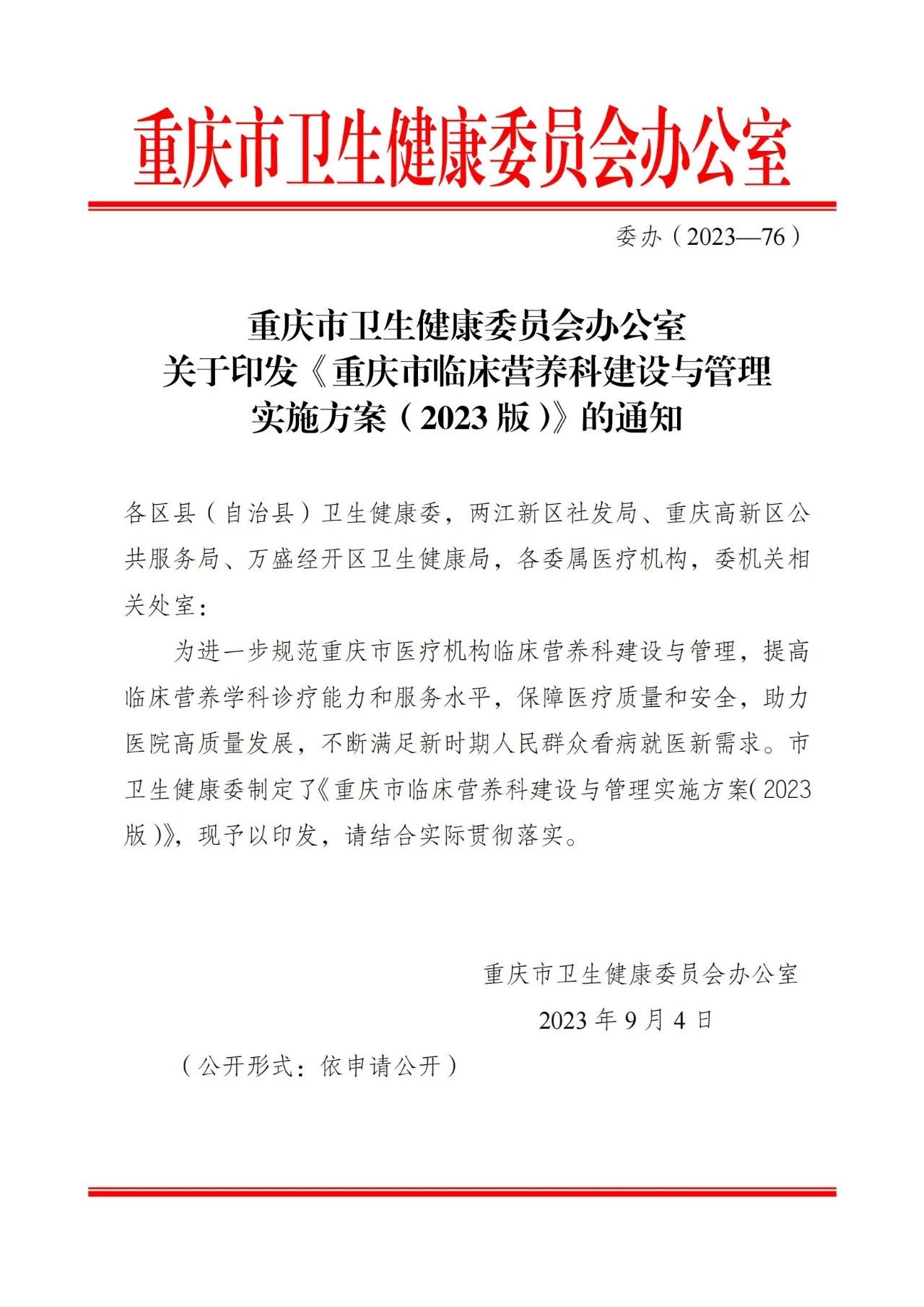 為進(jìn)一步規范重慶市醫療機構臨床營(yíng)養科建設與管理,提高臨床營(yíng)養學(xué)科診療能力和服務(wù)水平,保障醫療質(zhì)量和安全,助力醫院高質(zhì)量發(fā)展,不斷滿(mǎn)足新時(shí)期人民群眾看病就醫新需求。重慶市衛生健康委制定并發(fā)布《重慶市臨床營(yíng)養科建設與管理實(shí)施方案(2023版)》。
