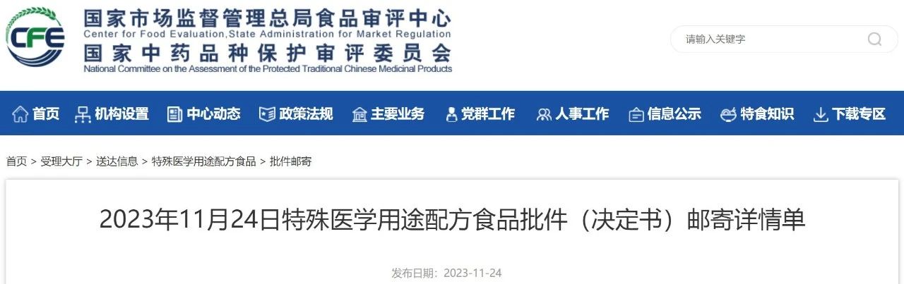 11月24日,總局審評中心發(fā)布特殊醫學(xué)用途配方食品批件郵寄詳情單,涉及冬澤特醫4款產(chǎn)品,詳情如下: