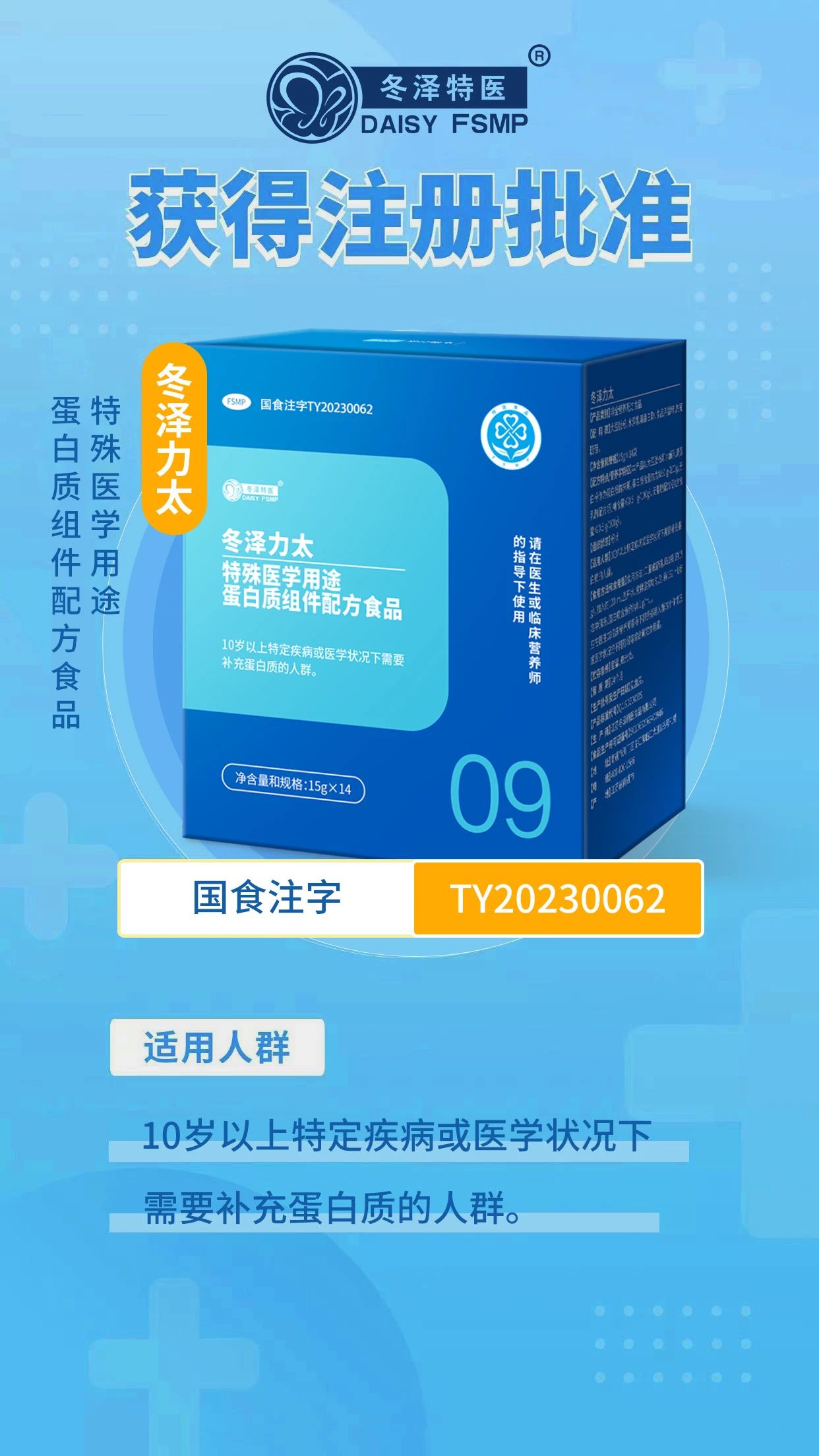 近日,冬澤特醫冬澤力太特殊醫學(xué)用途蛋白質(zhì)組件配方食品(以下簡(jiǎn)稱(chēng)冬澤力太)獲得國家市場(chǎng)監督管理總局頒發(fā)的“特殊醫學(xué)用途配方食品注冊證書(shū)”,批準文號為國食注字TY20230062。