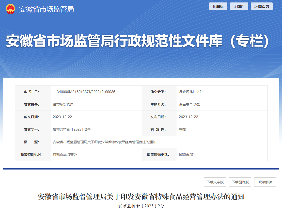 安徽省市場(chǎng)監督管理局關(guān)于印發(fā)安徽省特殊食品經(jīng)營(yíng)管理辦法的通知