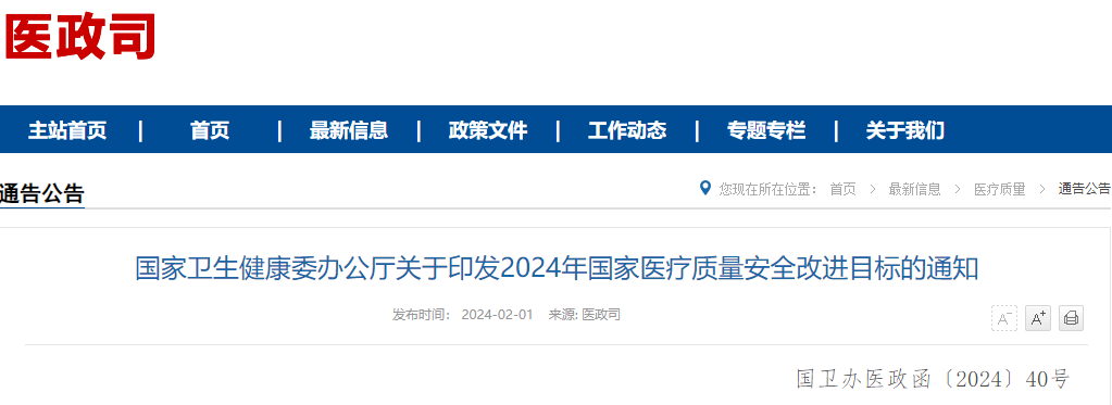 為進(jìn)一步加強以目標為導向的醫療質(zhì)量安全管理工作,我委組織制定了《2024年國家醫療質(zhì)量安全改進(jìn)目標》和各專(zhuān)業(yè)2024年質(zhì)控工作改進(jìn)目標,現印發(fā)給你們,請指導各級各專(zhuān)業(yè)質(zhì)控組織、醫療機構、行業(yè)團體做好組織實(shí)施工作,優(yōu)化改進(jìn)工作策略,創(chuàng )新工作機制和方式方法,深入推進(jìn)目標管理,實(shí)現醫療質(zhì)量安全持續改進(jìn)。各地要進(jìn)一步加強宣貫培訓,做好數據信息的收集、分析和反饋,不斷提升醫療質(zhì)量安全管理水平。