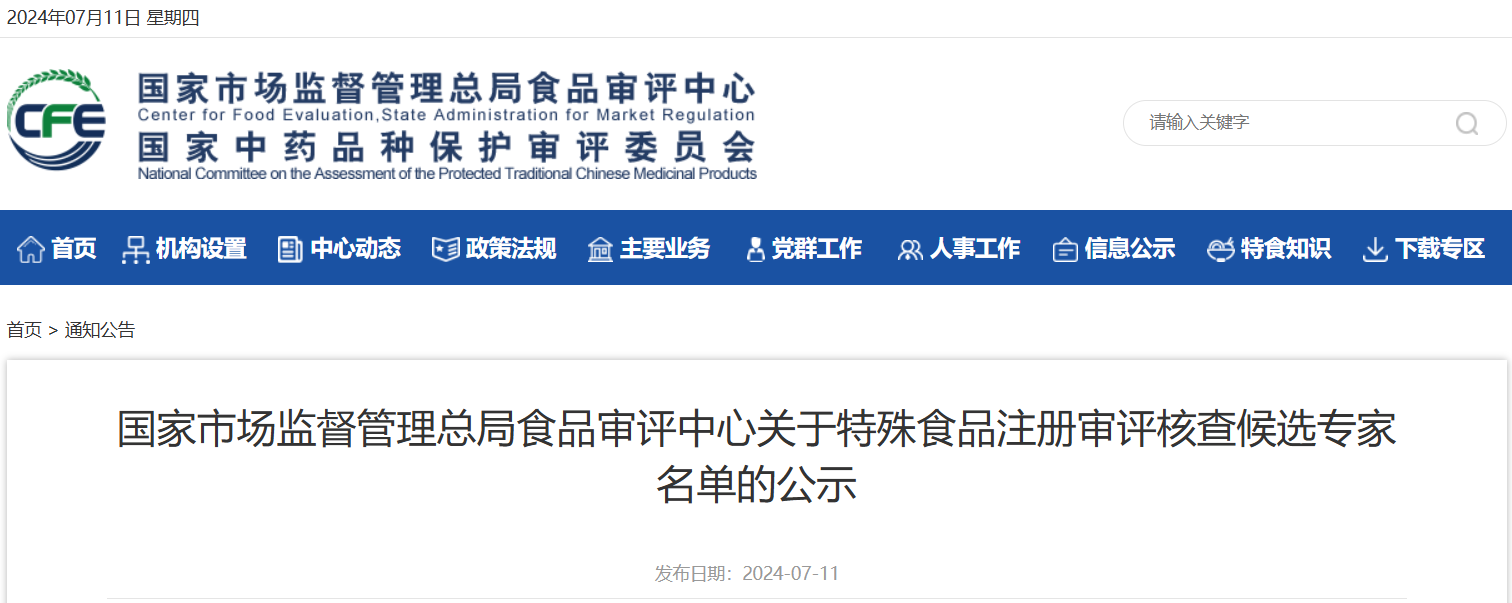 7月11日,國家市場(chǎng)監督管理總局食品審評中心關(guān)于特殊食品注冊審評核查候選專(zhuān)家名單的公示。