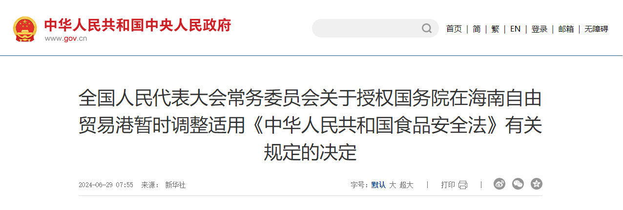 為支持海南全面深化改革開(kāi)放,推動(dòng)海南自由貿易港政策落地,6月28日,第十四屆全國人民代表大會(huì )常務(wù)委員會(huì )第十次會(huì )議決定:授權國務(wù)院在海南自由貿易港暫時(shí)調整適用《中華人民共和國食品安全法》有關(guān)規定,期限為五年。該決定自2024年10月1日起施行。