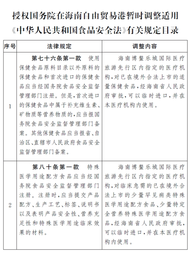 全國人大常委會(huì )法工委行政法室主任梁鷹近日在媒體就作出授權決定的背景、意義、主要內容以及如何理解暫時(shí)調整適用食品安全法有關(guān)規定等作出解讀。他表示:“為進(jìn)一步支持海南全面深化改革開(kāi)放,推動(dòng)海南自由貿易港政策落地,十四屆全國人大常委會(huì )第十次會(huì )議作出決定。該決定授權國務(wù)院在海南自由貿易港暫時(shí)調整適用食品安全法有關(guān)規定,允許海南博鰲樂(lè )城國際醫療旅游先行區內指定的醫療機構,對已在境外合法上市的適量保健食品和臨床急需的已在境外合法上市的少量罕見(jiàn)病類(lèi)特殊醫學(xué)用途配方食品、少量特定全營(yíng)養特殊醫學(xué)用途配方食品,經(jīng)海南省人民政府審批,可以臨時(shí)進(jìn)口,并在本醫療機構內使用?!?