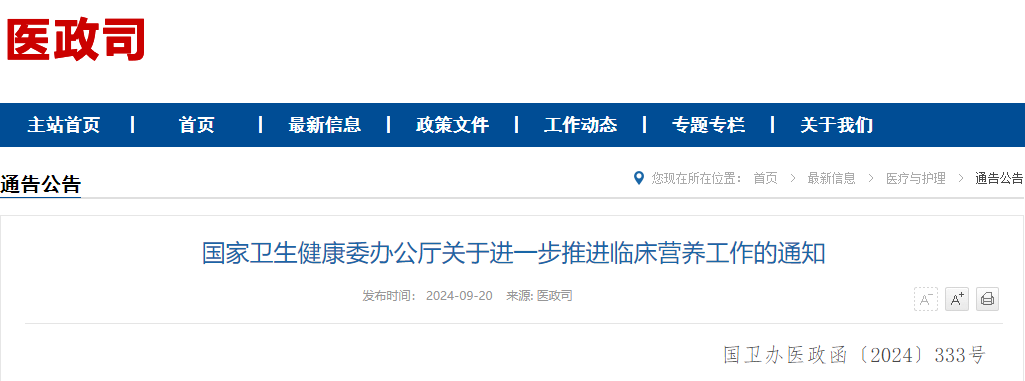 為進(jìn)一步強化臨床營(yíng)養工作落實(shí),推動(dòng)醫療服務(wù)高質(zhì)量發(fā)展,改善群眾就醫感受,近日,國家衛生健康委辦公廳制定印發(fā)了《關(guān)于進(jìn)一步推進(jìn)臨床營(yíng)養工作的通知》(以下簡(jiǎn)稱(chēng)《通知》)。