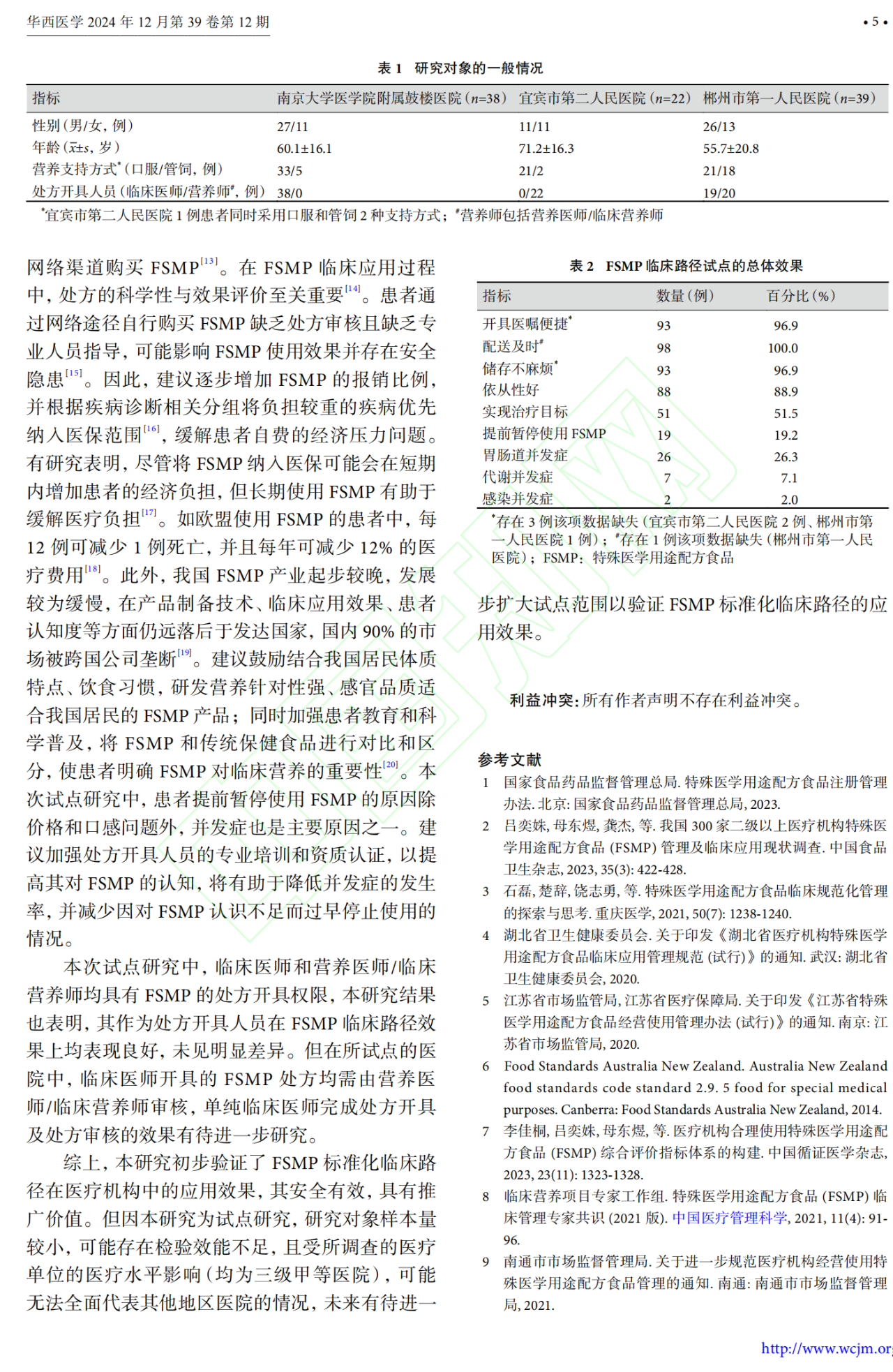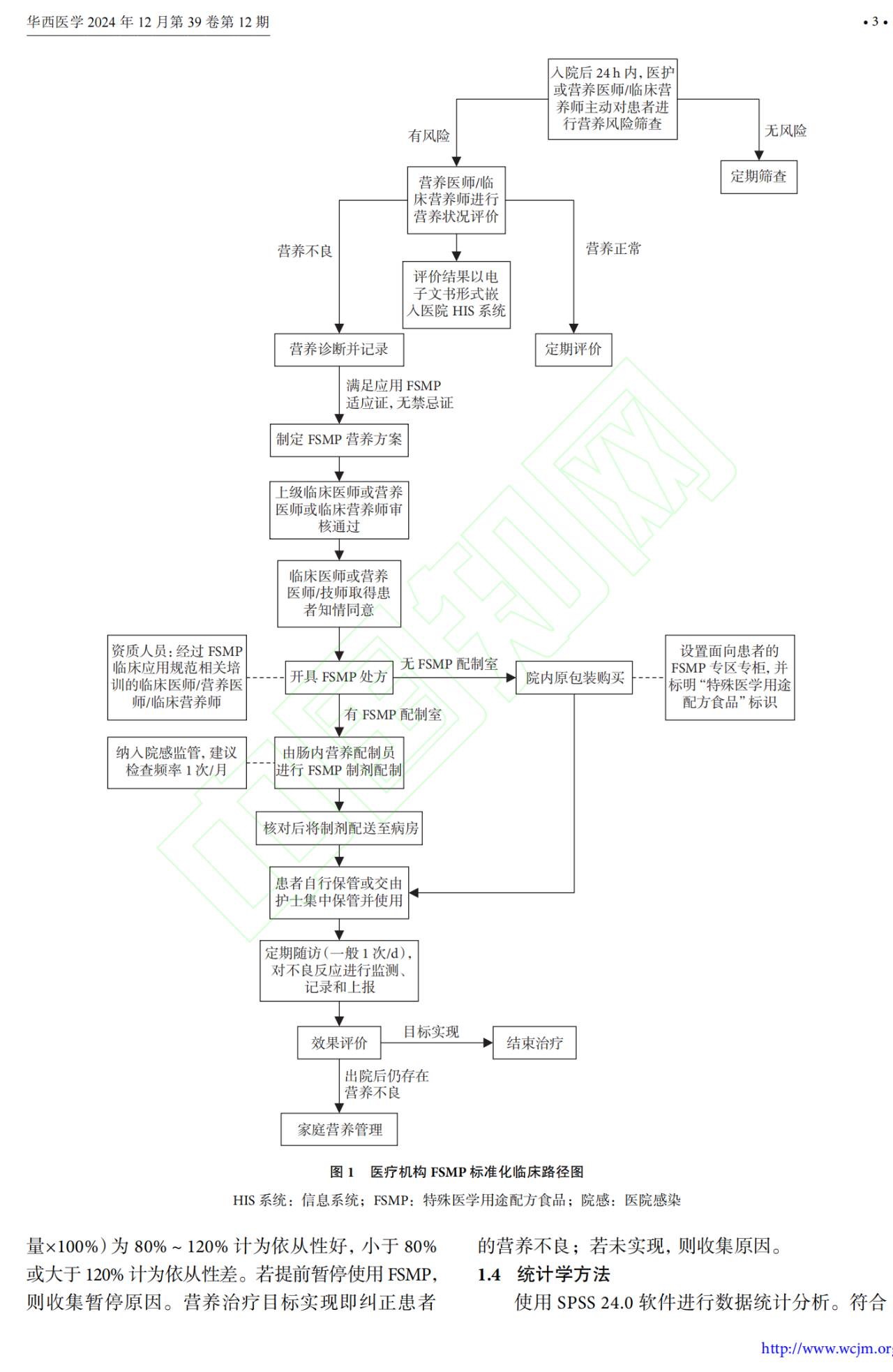 特殊醫學(xué)用途配方食品(FSMP)是為了滿(mǎn)足特定疾病狀態(tài)下人群對營(yíng)養素或膳食的特殊需要而專(zhuān)門(mén)加工配制的配方食品。隨著(zhù)FSMP在臨床上的廣泛應用,如何規范管理及合理使用成為關(guān)鍵問(wèn)題。本研究旨在探討FSMP標準化臨床路徑的可推廣性及實(shí)施效果,以期提高醫療機構對FSMP的管理水平和臨床應用效果。